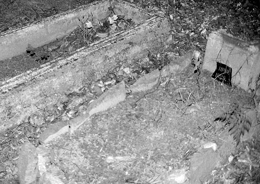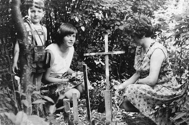 Enkelin Edith Ulrich (geb. Radde) mit Kinder Dirk und Rita 1970 am Grab von Otto Schütz in einem Garten in Klein Massowitz (Maslowiczki), wo Otto im März 1945 begraben wurde