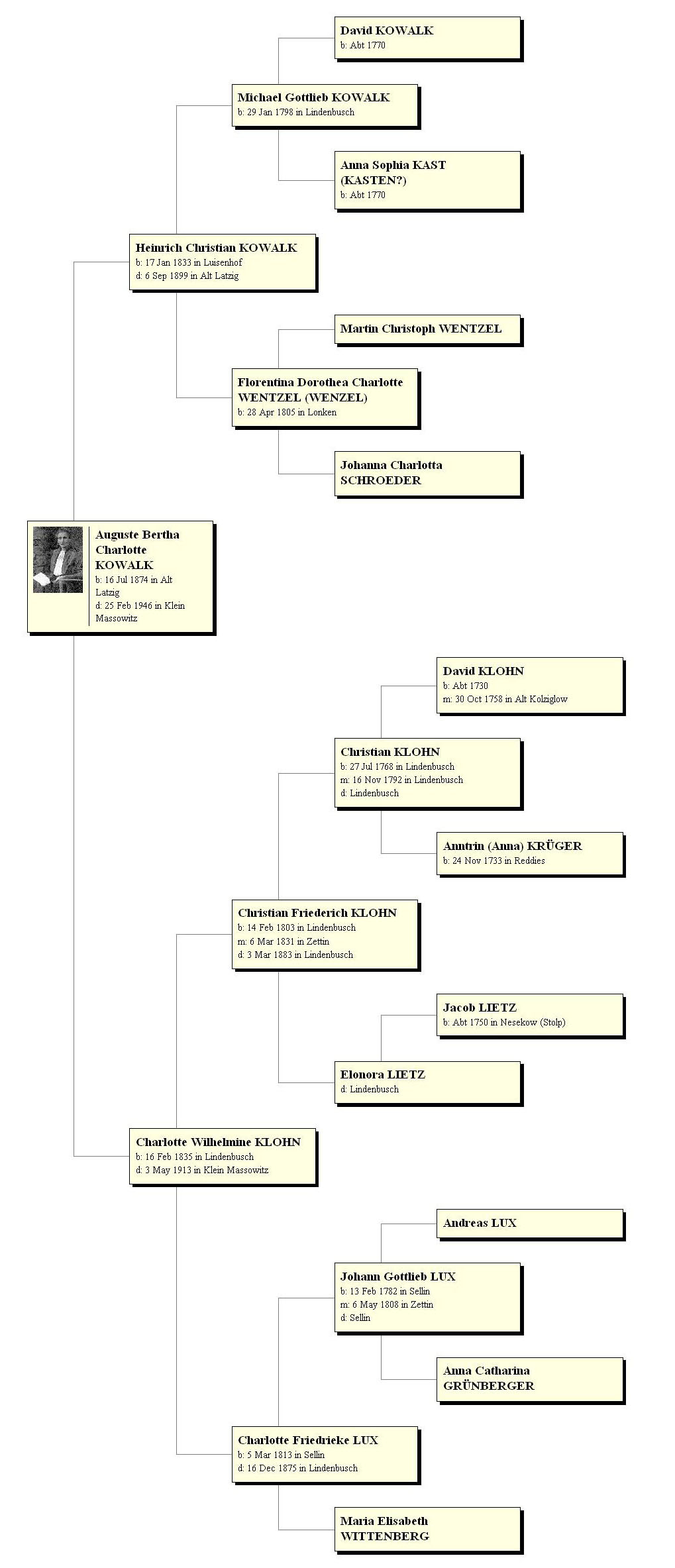 Vorfahren von Auguste Bertha Charlotte KOWALK (in 5 Generationen: KOWALK, KLOHN, LUX, LIETZ, WENTZEL, KAST, SCHROEDER, KRÜGER, GRÜNBERGER, WITTENBERG )