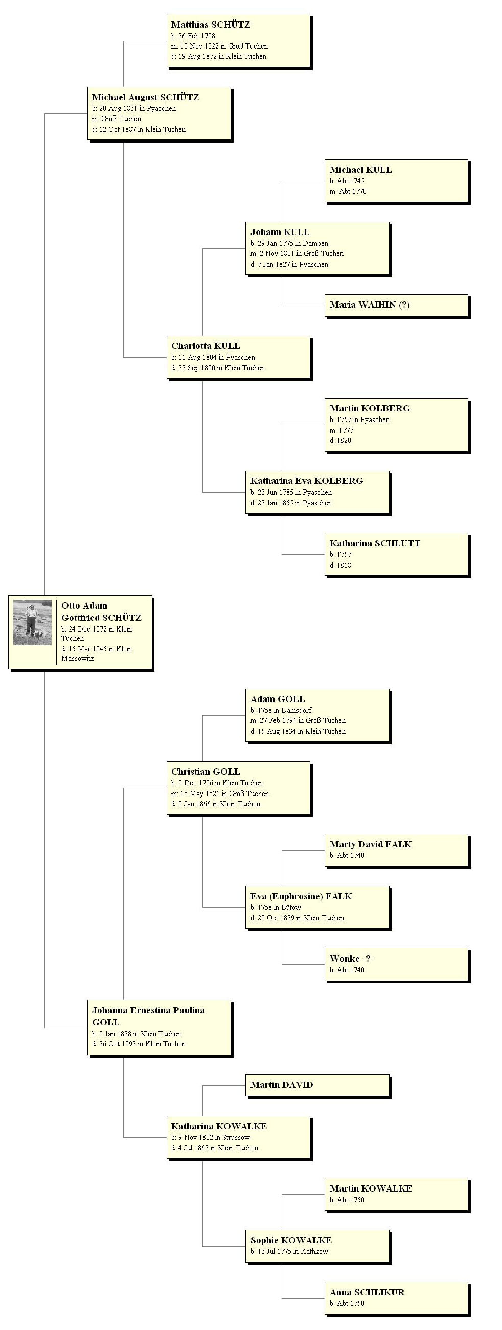 Vorfahren von Otto Adam Gottfried SCHÜTZ (in 6 Generationen: SCHÜTZ, GOLL, KOWALKE, WAIH, KOLBERG, SCHLUTT, FALK, SCHLIKUR, WOHLER)